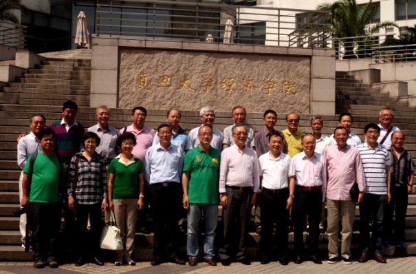 院长袁志刚教授,世界经济系主任黄亚钧教授,世界经济系庄起善教授,以及1979级世经系的二十余位校友们。