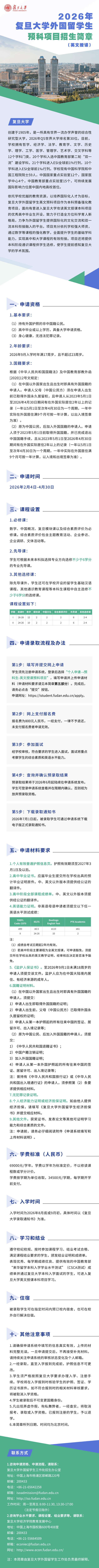 2026年复旦大学外国留学生预科项目招生简章(英文授课)