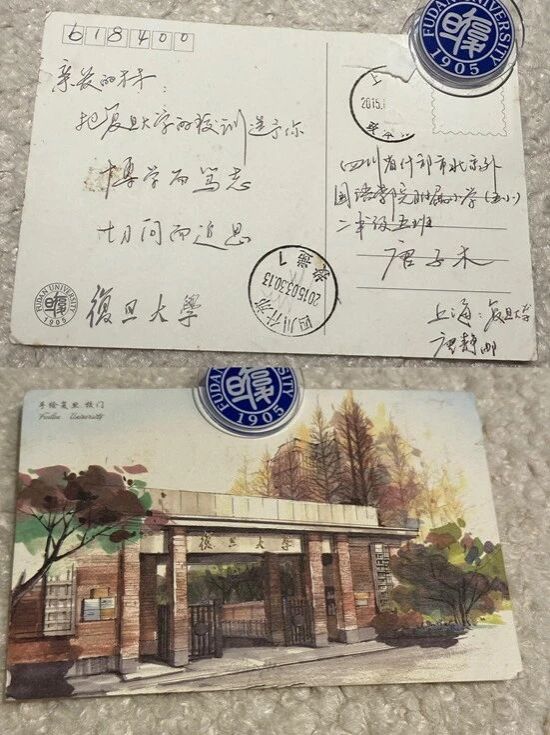 微风拂过发梢,带来窗外树叶的沙沙声。盛夏的阳光让人一些倦怠,黑板上的粉笔却一刻也不停歇。我端坐在课桌前,心思却在千里之外的上海。“爸爸会给我寄什么礼物回来呢?”我想着。咚咚咚,一阵短促的敲门声惊动了整个教室。“二年级五班,唐子木,你有一张明信片,嗯……来自复旦大学。”一阵欣喜在心中涌动,在同学们的注视下我收下了这样一份来自远方的礼物。我看着上面水彩画风的校门,一种梦幻的朦胧感席卷全身,让其注定在回忆里留下注脚。翻过来,是爸爸手写的祝福。我用手指认着:“博学而…不认识…志,切问而近思”。即使有无数的不解,却坚信这句校训的力量。