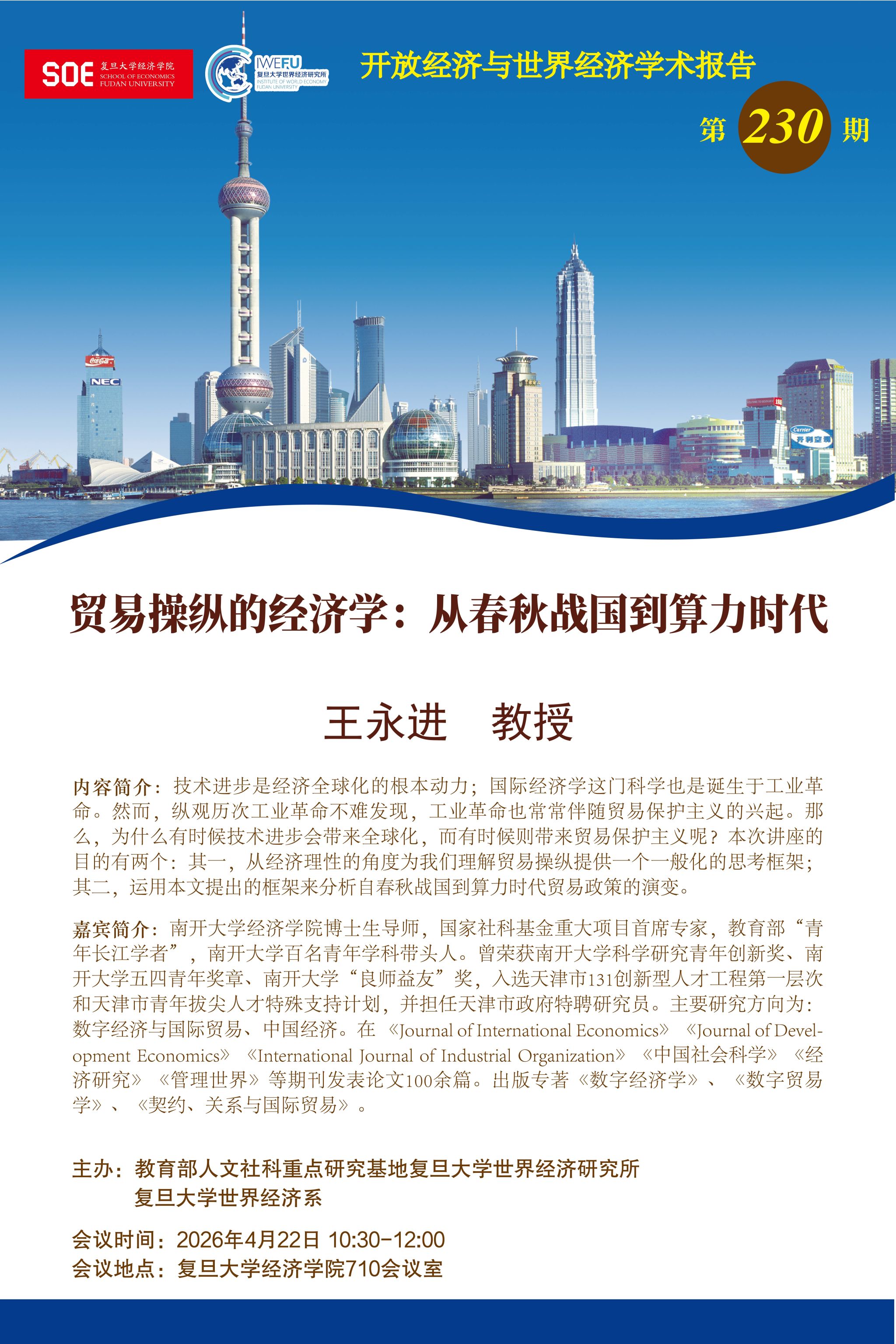 复旦大学世界经济研究所开放经济与世界经济学术报告第230期:贸易操纵的经济学:从春秋战国到算力时代