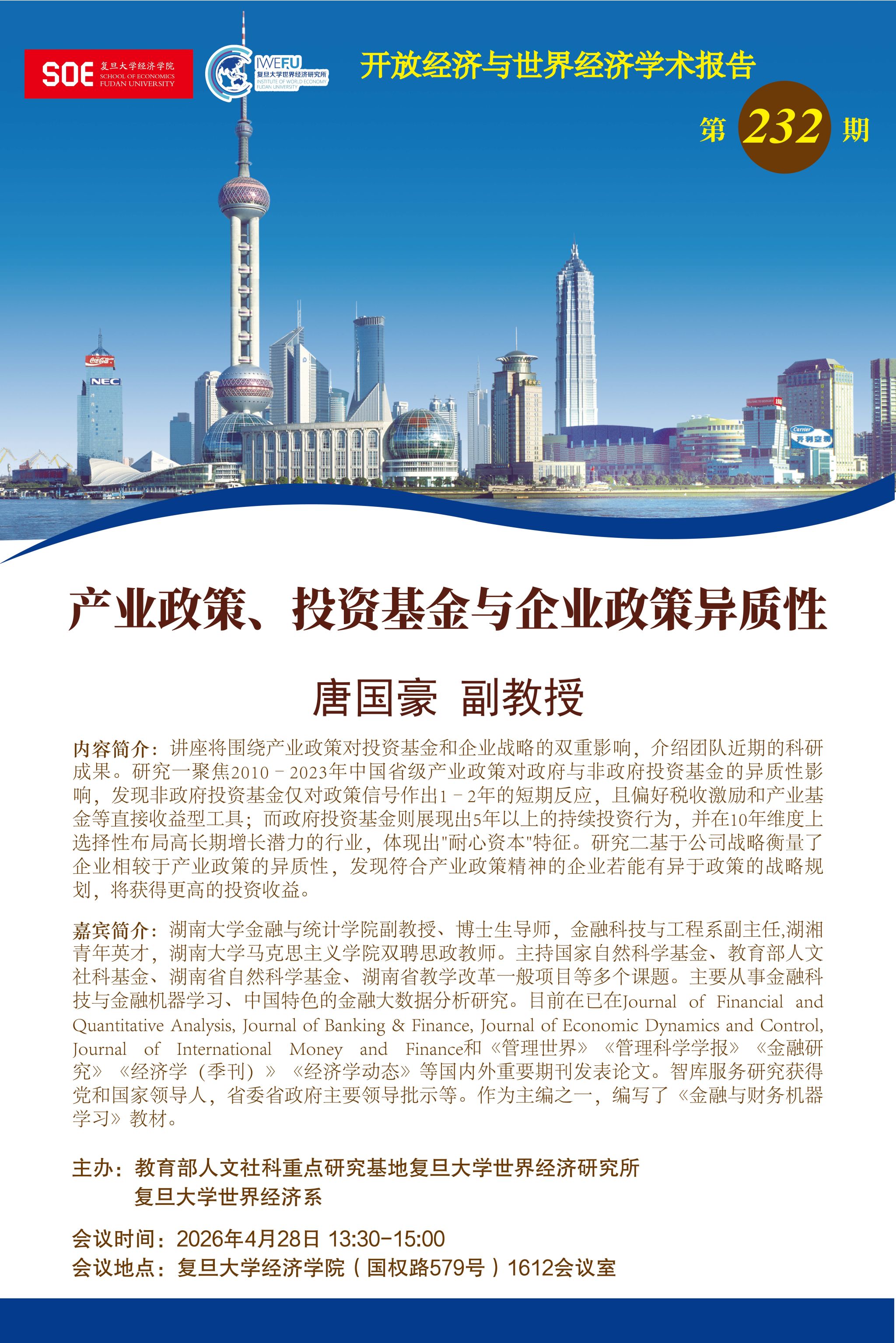 复旦大学世界经济研究所开放经济与世界经济学术报告第232期:产业政策、投资基金与企业政策异质性